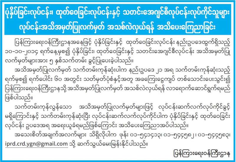 မြန်မာနိုင်ငံသားများဖြစ်ကြသည့် တိုင်းရင်းသားများနှင့် ဥပဒေအရနိုင်ငံသားများကို ဥပဒေနှင့်အညီ အိမ်ထောင်စုလူဦးရေစာရင်းနှင့် ကိုင်ဆောင်သင့်သည့် ကတ်ပြားတစ်မျိုးမျိုး ထုတ်ပေးရေး လုပ်ငန်း ဖြစ်သည့် ပန်းခင်းစီမံချက် အကောင်အထည်ဖော်ဆောင်ရွက်မှုဆိုင်ရာ (၆) လပတ် လုပ်ငန်း ညှိနှိုင်းအစည်းအဝေးကို နိုဝင်ဘာ ၂ ရက်၊ ၅ ရက်၊ ၉ ရက်နှင့် ၁၂ ရက်တို့တွင် နေပြည်တော်ရှိ လူဝင်မှုကြီးကြပ်ရေးနှင့်ပြည်သူ့အင်အားဝန်ကြီးဌာန၊ အစည်း အဝေးခန်းမ၌ ကျင်းပသည်။
