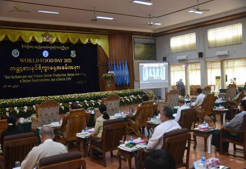 ၂၀၂၁ ခုနှစ်၊ ကမ္ဘာ့စားနပ်ရိက္ခာနေ့ အထိမ်းအမှတ်အခမ်းအနားကို ယနေ့နံနက် ၉ နာရီ ခွဲတွင် နေပြည်တော်ရှိ စိုက်ပျိုးရေး၊ မွေးမြူရေးနှင့် ဆည်မြောင်းဝန်ကြီးဌာန ပြည်ထောင်စု ဝန်ကြီးရုံး အစည်းအဝေးခန်းမ၌ ကျင်းပသည်။