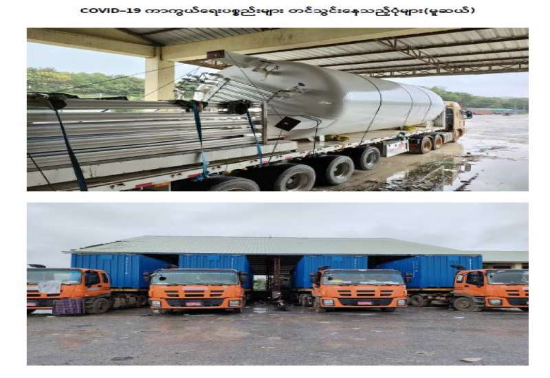စီးပွားရေးနှင့် ကူးသန်းရောင်းဝယ်ရေးဝန်ကြီးဌာနအနေဖြင့် ကိုဗစ်-၁၉ ရောဂါကာကွယ်၊ ထိန်းချုပ်၊ ကုသရေးဆိုင်ရာ ပစ္စည်းများကို လေကြောင်း၊ ရေကြောင်းနှင့် နယ်စပ်ကုန်သွယ်ရေးစခန်းများမှ အဆင်ပြေချောမွေ့စွာ တင်သွင်းနိုင်ရေး အတွက် အချိန်နှင့်တပြေးညီ စီစဉ်ဆောင်ရွက်ပေး လျက်ရှိရာ ယနေ့တွင် ရန်ကုန်အပြည်ပြည်ဆိုင်ရာလေဆိပ်၊ ဆိပ်ကမ်း များနှင့် မူဆယ်၊ မြဝတီနှင့် ချင်းရွှေဟော် နယ်စပ်ကုန်သွယ်ရေးစခန်း(၃)ခုတို့မှ တင်သွင်းရာ၌ ကုမ္ပဏီ(၇)ခုမှ ယာဉ်စီးရေ (၁၇)စီးဖြင့် အောက်ဆီဂျင်အရည် Browser ယာဉ်(၂)စီးဖြင့် တန်(၄၀)၊ အောက်ဆီဂျင် (အိုးခွံ) (၃၈၆၇) ခု၊ Oxygen Plant (၅၅)ခု၊ အိမ်သုံး Oxygen Concentrator (၁၈၀) ခုနှင့် နှာခေါင်းစည်း (Mask) (၂၄) တန် တင်သွင်းခဲ့သည်။ အောက်ဆီဂျင် အရည် Browser ယာဉ်(၂)စီးမှာ ရန်ကုန်မြို့သို့ ဖြစ်ပြီး Oxygen Plant (၅၅) ခုမှာ ဆိပ်ကမ်းမှ ရန်ကုန်မြို့သို့ အခု(၅၀) နှင့် မူဆယ်မှ ရန်ကုန်မြို့သို့(၃)ခု၊ သာစည်မြို့ သို့(၁)ခု၊ ချင်းရွှေဟော်မှ ပြင်ဦးလွင်မြို့သို့ (၁)ခုဖြစ်ကြောင်းသိရှိရသည်။