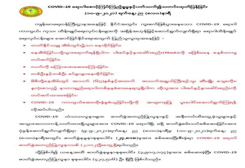 Coronavirus Disease 2019 (COVID-19) ကာကွယ်၊ ထိန်းချုပ်၊ ကုသရေးဗဟိုကော်မတီမှ အသိပေးကြေညာချက်