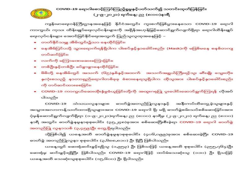 “ကိန်းဂဏန်းအချက်အလက်များအရ ရောဂါကူးစက်ဖြစ်ပွားမှုနှုန်း လျော့ကျလာပြီး အဆိုပါအချက်အလက်များသည် မှန်ကန်ခိုင်မာမှုရှိရန် လိုအပ်မည်ဖြစ်ကြောင်း၊ ဖြစ်ပွားနှုန်းအမှန်တကယ် လျော့နည်းလာမှသာ တင်းကျပ်ထားသည့် ကျန်းမာရေးဆိုင်ရာ စည်းကမ်းချက်များကို ဖြေလျှော့ပေးနိုင်မည်ဖြစ်ကြောင်း၊ ဒုတိယလှိုင်း၌ ရောဂါကူးစက်မှုနှုန်း လျော့ကျစဉ် ပေါ့ဆစွာဖြင့် နေထိုင်သွားလာခဲ့ခြင်းကြောင့် တတိယလှိုင်းဖြစ်ပွားစဉ် အခက်အခဲများစွာဖြင့် ရင်ဆိုင်တွေ့ကြုံခဲ့ရမှုများကို သင်ခန်းစာယူရမည်ဖြစ်ကြောင်း နိုင်ငံတော်စီမံအုပ်ချုပ်ရေးကောင်စီ ဥက္ကဋ္ဌ နိုင်ငံတော်ဝန်ကြီးချုပ် ဗိုလ်ချုပ်မှူးကြီး မင်းအောင်လှိုင် က ကိုဗစ်-၁၉ ရောဂါ ကာကွယ်၊ ထိန်းချုပ်၊ ကုသရေးဆိုင်ရာ (၁၀) ကြိမ်မြောက် အစည်းအဝေးတွင် ပြောကြားခဲ့သည်။