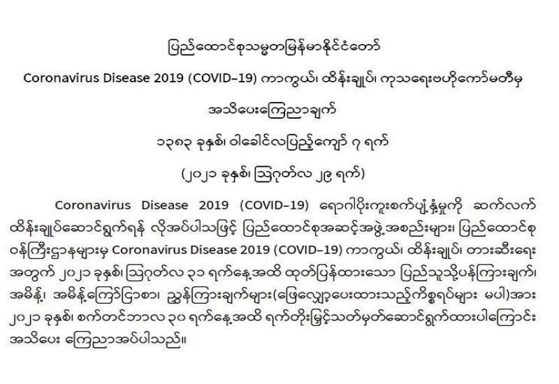ကျန်းမာရေးဝန်ကြီးဌာနအနေဖြင့် နိုင်ငံအတွင်း ကူးစက်ဖြစ်ပွားနေသော COVID-19 ရောဂါ ကာကွယ်၊ ကုသ၊ ထိန်းချုပ်ရေးလုပ်ငန်းများကို အရှိန်အဟုန်မြှင့်ဆောင်ရွက်လျက်ရှိရာ ရောဂါ ထိန်းချုပ်ရေးလုပ်ငန်းများ အောင်မြင်နိုင်ရေးအတွက် ပြည်သူလူထုအနေဖြင့် -