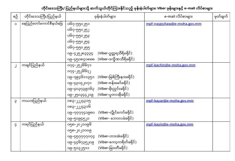 ယခုကာလအတွင်း လူသတ်မှု၊ လုယက်မှု၊ မီးရှို့မှု၊ မိုင်းဖောက်ခွဲမှု၊ လုံခြုံရေးတပ်ဖွဲ့ဝင်များအား ရည်ရွယ်ချက်ရှိရှိ တိုက်ခိုက်မှု၊ ပြည်သူ့ ဝန်ထမ်းများနှင့် ပြည်သူအချို့အား အုပ်စုဖွဲ့ ကိုယ်ထိလက်ရောက် တိုက်ခိုက်မှု၊ အစိုးရပိုင်အဆောက်အဦများနှင့်ပုဂ္ဂလိကပိုင်အဆောက်အဦ များအား ဖျက်ဆီးမှု၊ (CDM) လှုပ်ရှားမှုတွင် ငွေကြေးအရဖြစ်စေ၊ အခြားနည်းလမ်းဖြင့် ဖြစ်စေ၊ နက်ရှိုင်းစွာ ကာယကံမြောက် ပါဝင်သူ များမှအပ စိုးရိမ်စိတ်ကြောင့် ထွက်ပြေးတိမ်းရှောင်နေကြသည့် ဝန်ထမ်းများ၊ အသိပညာရှင်၊ အတတ်ပညာရှင်များ၊ အခြားနယ်ပယ် အသီးသီးမှ ပုဂ္ဂိုလ်များ၊ နိုင်ငံသားများအနေဖြင့် ဥပဒေဘောင်အတွင်း ပြန်လည်ဝင် ရောက်မည်ဆိုပါက ၎င်းတို့အပေါ် ရေးဖွင့်ထားသည့် အမှုများကို ဥပဒေနှင့်အညီပိတ်သိမ်းခြင်း၊ ရုပ်သိမ်းခြင်းများ ဆောင်ရွက် ပေးမည်ဖြစ်သည့်အတွက် မြန်မာနိုင်ငံရဲတပ်ဖွဲ့ ကွပ်ကဲမှုအောက်ရှိ တိုင်းဒေသကြီးနှင့် ပြည်နယ်အသီးသီးရှိ ရဲတပ်ဖွဲ့များသို့ ယုံကြည် စိတ်ချစွာဖြင့် ဆက်သွယ်နိုင်ရန် တယ်လီဖုန်းနံပါတ်များအား ဩဂုတ် ၃ ရက်မှစ၍ နေ့စဉ် သတင်းထုတ်ပြန်ကြေညာခဲ့ပြီး ဖြစ်သည်။