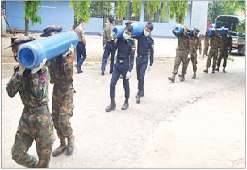 ကိုဗစ်-၁၉ ရောဂါဓာတ်ခွဲအတည်ပြု ပိုးတွေ့လူနာများနှင့် သီးသန့်စောင့် ကြည့်ရမည့်သူများကို ကုသရေး လုပ်ငန်းများ ဆောင်ရွက်ရာတွင် အောက်ဆီဂျင် လိုအပ်ချက်များကို တစ်ဖက်တစ်လမ်းမှ အထောက်အကူပြု စေရန်အတွက် တပ်မတော်နှင့် အလှူရှင်များက အောက်ဆီဂျင်အိုးများ၊ ရောဂါကာကွယ်ရေး အထောက် အကူပြုပစ္စည်းများကို တိုင်းဒေသကြီးနှင့် ပြည်နယ်အသီးသီးရှိ ပြည်သူ့ဆေးရုံများ၊ တပ်မတော် ဆေးရုံများ၊ ကျန်းမာရေးဌာနများ၊ ကိုဗစ်စင်တာများနှင့် လူမှုကူညီရေး အသင်းအဖွဲ့များသို့ ပေးပို့လှူဒါန်းလျက် ရှိသည်။