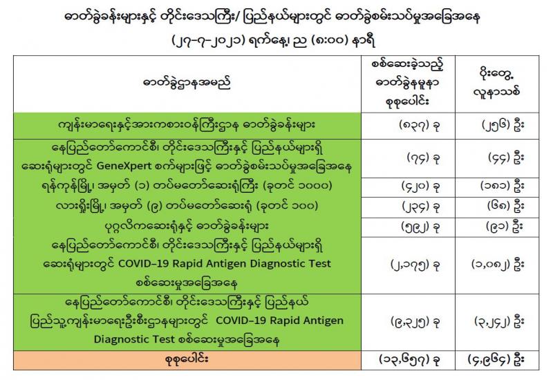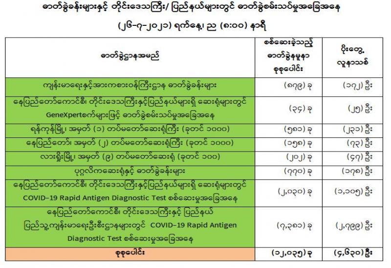 (၂၆-၇-၂၀၂၁)ရက်နေ့၊ ည (၈:၀၀)နာရီမှ (၂၇-၇-၂၀၂၁)ရက်နေ့၊ ည (၈:၀၀)နာရီအတွင်းဓာတ်ခွဲနမူနာစုစုပေါင်း(၁၃,၆၅၇)ခုအား စစ်ဆေးပြီးစီးခဲ့ရာCOVID-19 ရောဂါဓာတ်ခွဲအတည်ပြုလူနာသစ်(၄,၉၆၄)ဦးတွေ့ရှိရပါသည်။သို့ဖြစ်ပါ၍ ယနေ့အထိ ဓာတ်ခွဲနမူနာစုစုပေါင်း(၃,၁၀၂,၆၈၈)ခုအား စစ်ဆေးခဲ့ပြီး COVID-19 ဓာတ်ခွဲအတည်ပြုလူနာ စုစုပေါင်း (၂၇၉,၁၁၉) ဦး ရှိပြီ ဖြစ်ပါသည်။