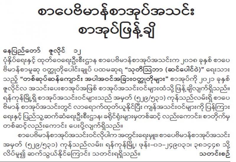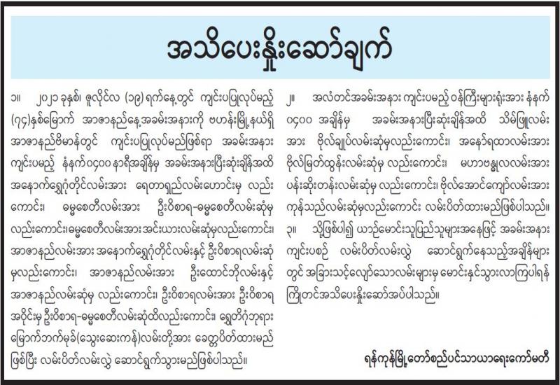 (၇၄)နှစ်မြောက် အာဇာနည်နေ့အခမ်းအနား ကျင်းပပြုလုပ်မည့် ဇူလိုင် ၁၉ ရက်(တနင်္လာနေ့) ၌ လေးဆူဓာတ်ပုံ ရွှေတိဂုံစေတီတော်မြတ်ကြီးအား အများပြည်သူ ဖူးမြော်ကြည်ညိုခွင့်ကို ယာယီတစ်ရက် ပိတ်ထားမည်ဖြစ်ရာ ဇူလိုင် ၂၀ ရက်မှစတင်၍ ယခင် အစီအစဉ်အတိုင်း ဖူးမြော်ခွင့်ပြန်လည်ဖွင့်လှစ်သွား မည်ဖြစ်ကြောင်း ရွှေတိဂုံစေတီတော် ဘဏ္ဍာတော်ထိန်း ဂေါပကအဖွဲ့မှ သိရသည်။