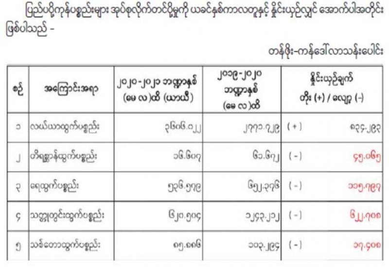 ၂၀၂၀-၂၀၂၁ ဘဏ္ဍာနှစ် (မေလထိ) မြန်မာနိုင်ငံ၏ ပြည်ပကုန်သွယ်မှု (ယာယီစာရင်းအရ) ပြည်ပပို့ကုန် တန်ဖိုးမှာ အမေရိကန်ဒေါ်လာ (၉.၆၉) ဘီလီယံ၊ ပြည်ပသွင်းကုန်တန်ဖိုး အမေရိကန်ဒေါ်လာ