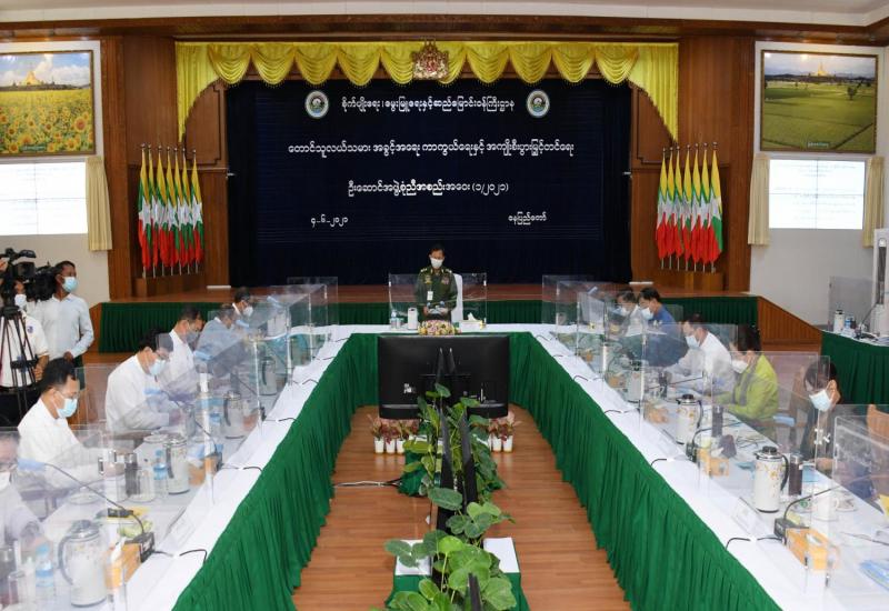 နိုင်ငံတော်စီမံအုပ်ချုပ်ရေးကောင်စီ စီမံခန့်ခွဲရေးကော်မတီ အစည်းအဝေး (၈/၂၀၂၁) ကို ယနေ့မွန်းလွဲပိုင်းတွင် နေပြည်တော်ရှိ နိုင်ငံတော်စီမံအုပ်ချုပ်ရေး ကောင်စီဥက္ကဋ္ဌရုံး အစည်းအဝေးခန်းမ၌ကျင်းပရာ နိုင်ငံတော်စီမံအုပ်ချုပ်ရေးကောင်စီ ဥက္ကဋ္ဌ၊ တပ်မတော်ကာကွယ်ရေးဦးစီးချုပ် ဗိုလ်ချုပ်မှူးကြီးမင်းအောင်လှိုင် တက်ရောက် အမှာစကား ပြောကြားသည်။