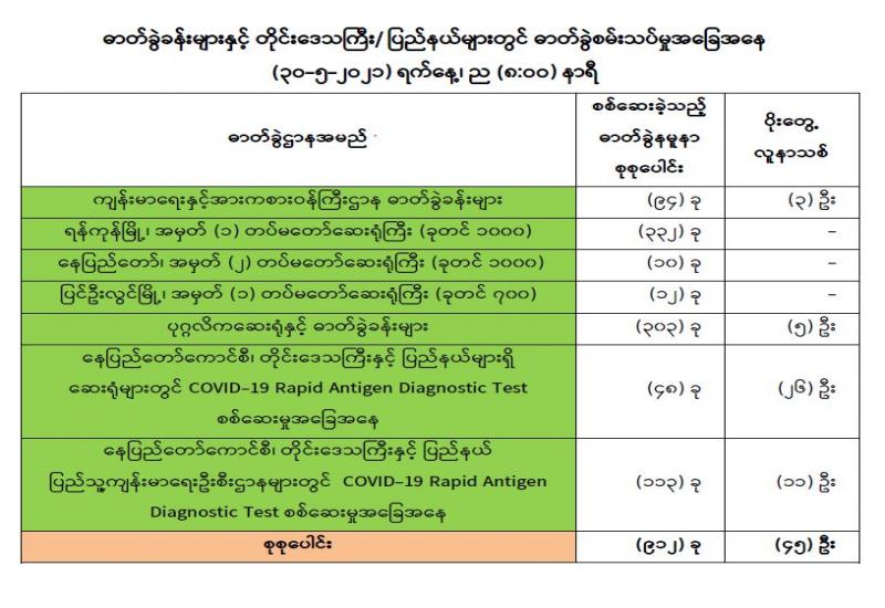 (၂၉-၅-၂၀၂၁) ရက်နေ့၊ ည (၈:၀၀) နာရီမှ (၃၀-၅-၂၀၂၁) ရက်နေ့၊ ည (၈:၀၀) နာရီအတွင်း ဓာတ်ခွဲနမူနာစုစုပေါင်း (၉၁၂) ခုအား စစ်ဆေးပြီးစီးခဲ့ရာ COVID-19 ရောဂါ ဓာတ်ခွဲအတည်ပြု လူနာသစ် (၄၅) ဦး တွေ့ရှိရပါသည်။ သို့ဖြစ်ပါ၍ ယနေ့အထိ ဓာတ်ခွဲနမူနာ စုစုပေါင်း (၂,၆၁၉,၆၄၂) ခု အား စစ်ဆေးခဲ့ပြီး COVID-19 ဓာတ်ခွဲအတည်ပြုလူနာ စုစုပေါင်း (၁၄၃,၅၇၁) ဦး ရှိပြီ ဖြစ်ပါသည်။