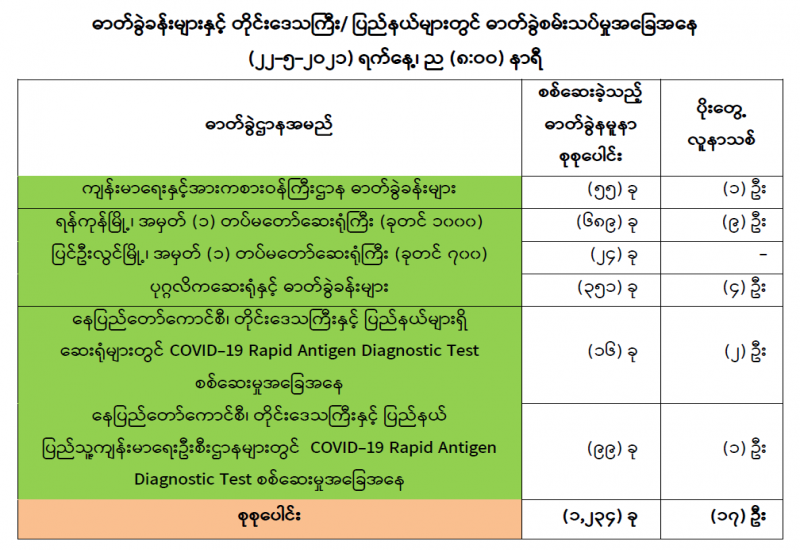 (၂၁-၅-၂၀၂၁) ရက်နေ့၊ ည (၈:၀၀) နာရီမှ (၂၂-၅-၂၀၂၁) ရက်နေ့၊ ည (၈:၀၀) နာရီအတွင်း ဓာတ်ခွဲနမူနာစုစုပေါင်း (၁,၂၃၄) ခုအား စစ်ဆေးပြီးစီးခဲ့ရာ COVID-19 ရောဂါ ဓာတ်ခွဲအတည်ပြု လူနာသစ် (၁၇) ဦး တွေ့ရှိရပါသည်။ သို့ဖြစ်ပါ၍ ယနေ့အထိ ဓာတ်ခွဲနမူနာ စုစုပေါင်း (၂,၆၁၀,၀၆၉) ခု အား စစ်ဆေးခဲ့ပြီး COVID-19 ဓာတ်ခွဲအတည်ပြုလူနာ စုစုပေါင်း (၁၄၃,၂၂၈) ဦး ရှိပြီ ဖြစ်ပါသည်။