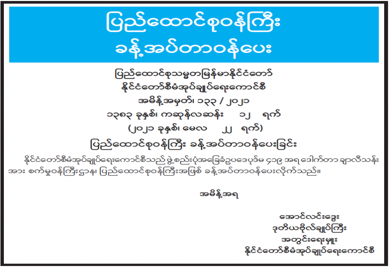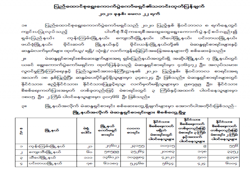 နိုင်ငံတော်စီမံအုပ်ချုပ်ရေးကောင်စီ၏ ရှေ့လုပ်ငန်းစဉ် (၅)ရပ်အနက် ပထမဆုံး လုပ်ငန်းစဉ်ဖြစ်သည့် မဲစာရင်းများ စစ်ဆေးခြင်းလုပ်ငန်းကို ပြည်ထောင်စုရွေးကောက်ပွဲကော်မရှင်က ဦးစီးဆောင်ရွက်လျက်ရှိသည်။ ယခုအခါတွင် ၂၀၂၀ပြည့် နှစ်က ရွေးကောက်ပွဲကျင်းပခဲ့သည့် မြို့နယ် ၃၁၅ မြို့နယ်အနက် ၃၀၆ မြို့နယ်၏ မဲစာရင်းများကို စစ်ဆေးခဲ့သည်။ မဲစာရင်းစစ်ဆေးအဖြေထုတ်ရန် မြို့နယ် ကိုးမြို့နယ်သာကျန်ရှိပြီး မကြာမီတွင် မဲစာရင်းစစ်ဆေးမှုများ ပြီးစီးတော့မည်ဖြစ်သည်။