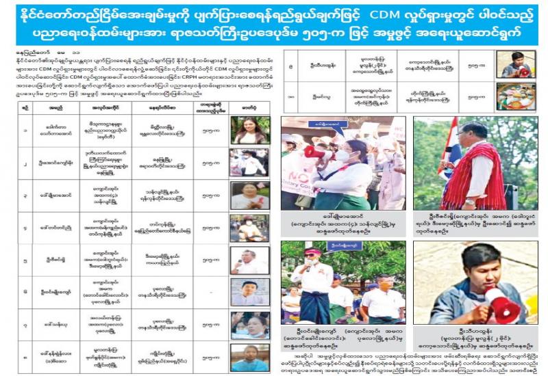 လုံခြုံရေးတပ်ဖွဲ့ဝင်များ အနေဖြင့် တည်ငြိမ်အေးချမ်းရေးနှင့် တရားဥပဒေ စိုးမိုးရေး လုပ်ငန်း များကို အရှိန်အဟုန် မြှင့် ဆောင်ရွက်လျက်ရှိရာ လူမှုကွန်ရက် စာမျက်နှာပေါ်၌ တပ်မတော်အား တိုက်ခိုက်စော်ကားသည့် စာများ ရေးသားသူများဖြစ်ကြသည့် မဝင်း စုလှိုင် (ဘ) ဦးတင်အောင်ဝင်းနှင့် ညီမ ဖြစ်သူမမေဇွန်ကို (ဘ) ဦးတင်အောင်ဝင်းတို့ နှစ်ဦးကို မေ ၁ ရက်တွင် ဖမ်းဆီး ထိန်းသိမ်းပြီး စစ်ဆေးမှုများဆောင်ရွက် ခဲ့သည်။
