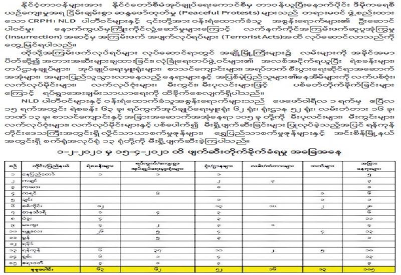 မြို့နယ်အချို့၌ ဆူပူအကြမ်းဖက်သူများအနေဖြင့် မြို့နယ်အချို့၌ ဆူပူအကြမ်းဖက်သူများမှ နိုင်ငံတော်ပိုင် အဆောက်အဦများ၊ အများပြည်သူပိုင် အဆောက်အဦ များအား မီးရှို့ဖျက်ဆီးမှုများ ဆောင်ရွက်လျက်ရှိသည်။