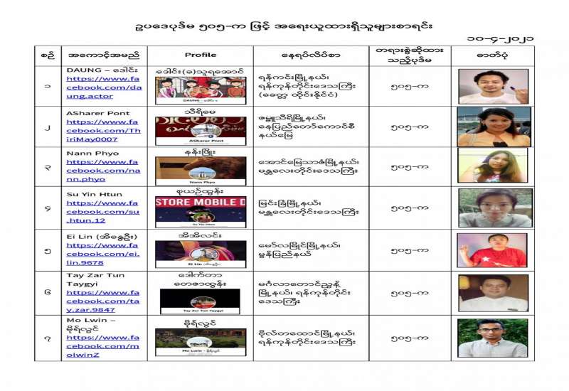 နိုင်ငံတော်၏ အုပ်ချုပ်မှုယန္တရားပျက်ပြားစေရန်ရည်ရွက်ချက်ဖြင့် နိုင်ငံ့ဝန်ထမ်းများအား CDM လှုပ်ရှားမှုတွင် ပါဝင်စေရန်လှုံ့ဆော်ခြင်း၊ CRPH မတရားအသင်းအား ထောက်ခံသည့် အကြောင်းအရာများ၊ မမှန်သတင်းများအားဖြန့်ဝေခြင်း၊ နိုင်ငံတော်တည်ငြိမ်အေးချမ်းမှုကို ပျက်ပြားစေပြီး ဆူပူအုံကြွမှုဖြစ်ပေါ်စေရန်နှင့် အများပြည်သူအထိတ်တလန့်ဖြစ်စေရန် အတွက် သွေးထိုးလှုံ့ဆော်မှုများပြုလုပ်ခြင်း၊ Social Pumishment ပြုလုပ်ခြင်းများကို လူမှုကွန်ရက် စာမျက်နှာများတွင် ရည်ရွယ်ချက်ရှိရှိ ဖြင့်ဖော်ပြခြင်းနှင့် ဖြန့်ဝေခြင်းများ ဆောင်ရွက် လျက်ရှိသည့် အောက်ဖော်ပြပါ အနုပညာရှင်အချို့နှင့် အခြားပါဝင်ပတ်သက်သူများအား ရာဇသတ်ကြီးပုဒ်မ ၅၀၅-က ဖြင့် အမှုဖွင့်အရေးယူ ဆောင်ရွက်လျက်ရှိပါသည်။