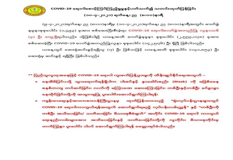 ယနေ့နံနက်(၀၉:၃၀)နာရီအချိန်ထိမိုးလေဝသတိုင်းထွာချက်အကျဉ်းချုပ်။ လွန်ခဲ့သော(၂၄)နာရီအတွင်းက ရှမ်းပြည်နယ်(မြောက်ပိုင်း)တွင် နေရာအနှံ့ အပြား၊ စစ်ကိုင်းတိုင်းဒေသကြီးအထက်ပိုင်း၊ တနင်္သာရီတိုင်းဒေသကြီးနှင့် ရှမ်းပြည်နယ်(တောင်ပိုင်း)တို့တွင် နေရာစိပ်စိပ်၊ ကချင်ပြည်နယ်နှင့် ချင်းပြည်နယ် တို့တွင် နေရာကျဲကျဲနှင့် စစ်ကိုင်းတိုင်းဒေသကြီးအောက်ပိုင်း၊ မန္တလေးတိုင်းဒေသကြီး၊ ပဲခူးတိုင်းဒေသကြီး၊ ရှမ်းပြည်နယ်(အရှေ့ပိုင်း)နှင့် မွန်ပြည်နယ်တို့တွင် နေရာကွက်ကျား မိုးထစ်ချုန်းရွာခဲ့ပြီး၊ ကျန်တိုင်းဒေသကြီးနှင့် ပြည်နယ်တို့တွင် တိမ်အသင့်အတင့် ဖြစ်ထွန်းခဲ့ပါသည်။ နေ့အပူချိန်များမှာ စစ်ကိုင်းတိုင်း ဒေသကြီးအထက်ပိုင်းနှင့် ကချင်ပြည်နယ်တို့တွင် ဧပြီလ၏ ပျမ်းမျှအပူချိန်တို့ထက် (၃)ဒီဂရီစင်တီဂရိတ်နှင့် စစ်ကိုင်းတိုင်းဒေသကြီးအောက်ပိုင်း၊ မန္တလေး တိုင်းဒေသကြီး၊ မကွေးတိုင်းဒေသကြီး၊ ချင်းပြည်နယ်၊ ကရင်ပြည်နယ်နှင့် မွန်ပြည်နယ်တို့တွင် ဧပြီလ၏ ပျမ်းမျှအပူချိန်တို့ထက် (၂)ဒီဂရီစင်တီဂရိတ်ပိုခဲ့ပြီး၊ ကယားပြည်နယ်တွင် ဧပြီလ၏ ပျမ်းမျှအပူချိန်အောက် (၂)ဒီဂရီစင်တီဂရိတ်လျော့နည်းခဲ့ကာ၊ ကျန်တိုင်းဒေသကြီးနှင့် ပြည်နယ်တို့တွင် ဧပြီလ၏ ပျမ်းမျှ အပူချိန်ခန့်သာ ရှိခဲ့ပါသည်။ ထူးခြားသည့် နေ့အပူချိန်များမှာ ချောက်မြို့တွင် (၄၄)ဒီဂရီစင်တီဂရိတ်၊ ဂန့်ဂေါမြို့တွင် (၄၃)ဒီဂရီစင်တီဂရိတ်နှင့် စစ်ကိုင်းမြို့၊ မန္တလေးမြို့၊ မြင်းခြံမြို့၊ ညောင်ဦးမြို့၊ တံတားဦး(လေကြောင်းမိုးလေဝသ)၊ မကွေးမြို့နှင့် ဆင်ဖြူကျွန်းမြို့တို့တွင် (၄၂)ဒီဂရီစင်တီ ဂရိတ်စီတို့ ဖြစ်ကြပါသည်။ မှတ်သားဖွယ်ရာ မိုးရေချိန်များမှာ တမူးတွင် (၀.၈၃)လက်မ၊ မဒေါက်မြို့တွင် (၀.၇၁)လက်မ၊ သီပေါမြို့နှင့် နောင်ချိုမြို့တို့တွင် (၀.၅၀)လက်မစီ၊ လွိုင်လင် မြို့တွင် (၀.၃၅)လက်မ၊ ဖြူးမြို့တွင် (၀.၃၂)လက်မနှင့် ကျောက်မဲမြို့နှင့် မိုးကုတ်မြို့တို့တွင် (၀.၂၇)လက်မစီတို့ ဖြစ်ကြပါသည်။