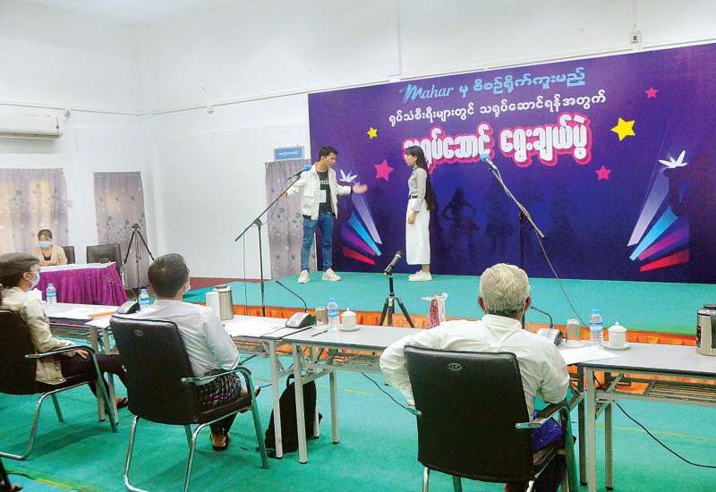 အနာဂတ်မျိုးဆက်သစ် အနုပညာရှင် များ ပေါ်ထွက်လာစေရန် ရည်ရွယ်၍ မဟာမှ စီစဉ်ရိုက်ကူးမည့် ရုပ်သံစီးရီး များတွင် သရုပ်ဆောင်ရန်အတွက် သရုပ်ဆောင်ရွေးချယ်ပွဲကို ယနေ့ နံနက်ပိုင်းက ရန်ကုန်မြို့ ဗဟန်း မြို့နယ် ရွှေတောင်ကြားလမ်း အမှတ် (၅၀)ရှိ ပြန်ကြားရေးနှင့် ပြည်သူ့ ဆက်ဆံရေးဦးစီးဌာန ရုပ်ရှင်အနုပညာ ရပ်ဝန်း၌ ကျင်းပသည်။ (အပေါ်ပုံ)