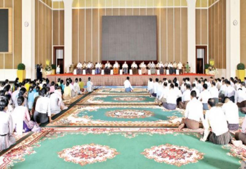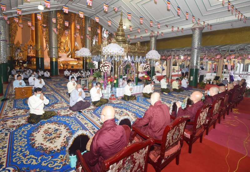 ၂၀၂၁ ခုနှစ် သာသနာတော်ဆိုင်ရာ ဘွဲ့တံဆိပ်တော်များ ဆက်ကပ်ပူဇော်ပွဲ မဟာမင်္ဂလာ အခမ်းအနားကို ယနေ့မွန်းလွဲပိုင်းတွင် နေပြည်တော် ဥပ္ပါတသန္တိစေတီတော် ပရိဝုဏ်အတွင်းရှိ သာသနာ့မဟာဗိမာန်တော်ကြီး၌ ကျင်းပရာ နိုင်ငံတော်စီမံအုပ်ချုပ်ရေးကောင်စီ ဥက္ကဋ္ဌ၊ တပ်မတော်ကာကွယ်ရေးဦးစီးချုပ် ဗိုလ်ချုပ်မှူးကြီး မင်းအောင်လှိုင်နှင့် ဇနီး ဒေါ်ကြူကြူလှတို့ တက်ရောက်ကြည်ညို၍ သာသနာတော်ဆိုင်ရာ ဘွဲ့တံဆိပ်တော်များ ဆက်ကပ်ပူဇော်ကြသည်။