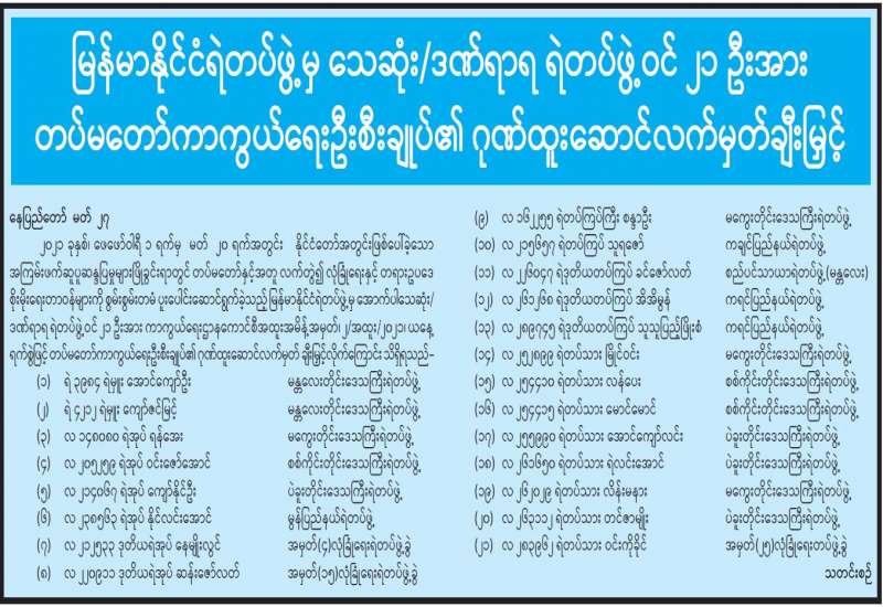 မန္တလေးတိုင်းဒေသကြီး မိတ္ထီလာ ခရိုင် သာစည်မြို့နယ်ဆေးရုံ၊ ဟံဇားတိုက်နယ်ဆေးရုံ၊ ယင်းမာ ပင်တိုက်နယ် ဆေးရုံ၊ သပိတ်ကျင်း မြို့နယ် တကောင်းတိုက်နယ် ဆေးရုံ၊ ကျောက်ဆည်မြို့နယ် စဉ့်ကိုင်ပြည်သူ့ဆေးရုံ၊ ပျော်ဘွယ် မြို့နယ် ယင်းတော်တိုက်နယ် ဆေးရုံ၊ ဝမ်းတွင်းမြို့နယ် ပင်းတလဲ တိုက်နယ်ဆေးရုံ၊ မြစ်သားမြို့နယ် ပြည်သူ့ဆေးရုံ၊ တောင်သာမြို့ နယ် ဝဲလောင်တိုက်နယ်ဆေးရုံ၊ ကျောက်ပန်းတောင်း မြို့နယ် ပြည်သူ့ဆေးရုံ၊ ပဲခူးတိုင်းဒေသ ကြီး ကျောက်တံခါးမြို့နယ် ပြည်သူ့ဆေးရုံ၊ ရွှေကျင်မြို့နယ် ဒုံဇရစ်ကျေးရွာ တိုက်နယ်ဆေးရုံ နှင့် လက်ပံတန်းမြို့နယ် ပြည်သူ့ ဆေးရုံတို့ရှိ ဝန်ထမ်းများနှင့် လူနာရှင်များက အကူအညီ တောင်းခံမှုကြောင့် တပ်မတော်မှ ဆေးကုသရေး အဖွဲ့များအား စေလွှတ်၍ ရောဂါဝေဒနာခံစား နေရသည့်ဒေသခံပြည်သူများအား လိုအပ်သည့် ကျန်းမာရေးစောင့် ရှောက်မှုလုပ်ငန်းများ ဆောင်ရွက် ပေးလျက်ရှိရာ ယနေ့တွင်လည်း ခွဲစိတ်ကုသမှုဆိုင်ရာ ရောဂါ၊ သွားနှင့် ခံတွင်းရောဂါ၊ အရိုး အကြောရောဂါ၊ အစာအိမ်ရောဂါ၊ မျက်စိရောဂါ၊ နား၊ နှာခေါင်း၊ လည်ချောင်းရောဂါ၊ သားဖွား မီးယပ်ရောဂါ၊ သွေးတိုးရောဂါ၊ နှလုံးရောဂါ၊ အထွေထွေရောဂါတို့နှင့် ပတ်သက်၍ လိုအပ်သည့် -ကျန်းမာရေး စစ်ဆေးကုသပေး ခြင်းများကို ဆက်လက်ဆောင် ရွက်ပေးပြီး ခွဲစိတ်ကုသရန်လိုအပ် သော လူနာများအား ခွဲစိတ်ကုသ ပေးခြင်းများ ဆောင်ရွက်ပေး ခဲ့သည်။