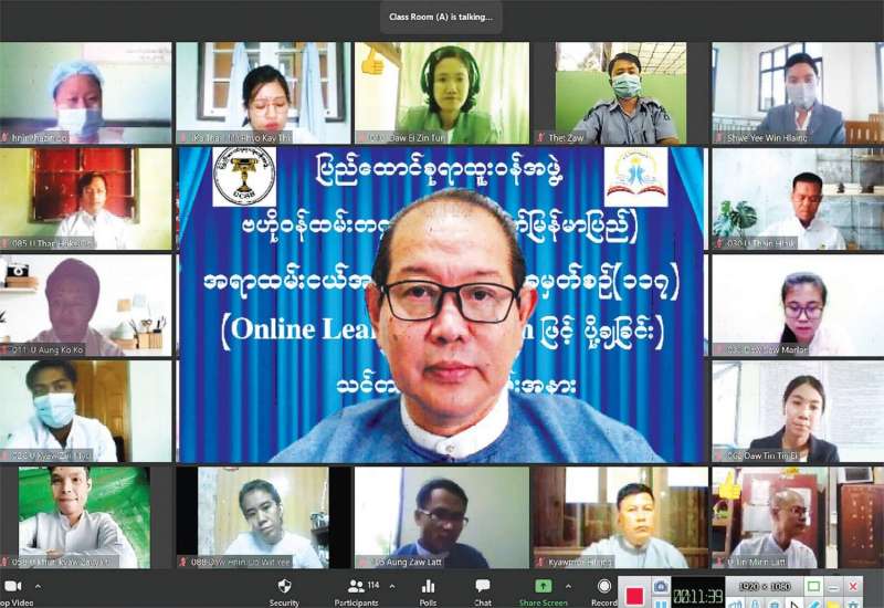 အရာထမ်းငယ် အခြေခံသင်တန်းအမှတ်စဉ်(၁၁၇)ကို Online Learning System ဖြင့် ဖွင့်လှစ်ပို့ချခြင်း သင်တန်းဖွင့်ပွဲအခမ်းအနားကို ယနေ့ နံနက် ၈ နာရီ တွင် ရန်ကုန်တိုင်းဒေသကြီး လှည်းကူးမြို့နယ် ဗဟို ဝန်ထမ်းတက္ကသိုလ် (အောက်မြန်မာပြည်) တွင် ကျင်းပရာ ပါမောက္ခချုပ် ဦးကျော်ဝင်းဟန်က သင်တန်းဖွင့်အမှာစကား ပြောကြားပြီး (ဝဲအောက်ပုံ)ဒုတိယ ပါမောက္ခချုပ်များ၊ ဌာနကြီးမှူးများ၊ ပညာ ဌာနများမှ ပါမောက္ခများ၊ သင်ကြားပို့ချမည့် ဆရာ ဆရာမများနှင့် သင်တန်းသား သင်တန်းသူများ တက်ရောက်ကြသည်။