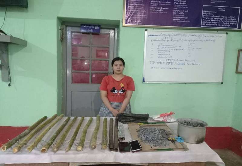 ပဲခူးတိုင်းဒေသကြီး၊ လက်ပံတန်းမြို့နယ်၊ ကျွန်းကလေးကျေးရွာအုပ်စု၊ အနောက်စု ရပ်ကွက်နေ ချောကိုကိုထွန်း၊ အသက်(၂၆)နှစ်၊ မဝင်းဝင်းမော်၊ အသက်(၃၀)နှစ်တို့သည် ၎င်းတို့ ၏ နေအိမ်၌ ဆူပူအကြမ်းဖက်လုပ်ရပ်များဆောင်ရွက်ရန်အတွက် ဒေသန္တရလက်လုပ်မီးခိုးမိုင်း များပြုလုပ်လျက်ရှိကြောင်း တည်ငြိမ်အေးချမ်းမှုကို လိုလားသည့် တာဝန်သိပြည်သူများ၏ သတင်းပေးချက်အရ လုံခြုံရေးတပ်ဖွဲ့ဝင်များက မတ် ၁၅ ရက် ည ၇ နာရီခန့်တွင် သွားရောက် စစ်ဆေးရှာဖွေခြင်းများပြုလုပ်ရာ မဝင်းဝင်းမော်နှင့်အတူ ယမ်းစိမ်း ၁ ပိဿာ၊ ရောင်စုံဖယောင်း ခဲတံ ၄၈ ချောင်း၊ မီးခိုးမိုင်းပြုလုပ်ရာတွင် အသုံးပြုသည့် မတ်ခွက် ၂ ခွက်၊ ခဲပြားစက္ကူ ၁ လိတ်၊ ၂ ဒသမ ၅ လက်မခန့်ရှိ ဝါးလုံးထိပ်တွင် သံများ ကန့်လန့်ဖြတ်ရိုက်ထားသည့် သံဆူးတုတ် ၁၂ ချောင်း၊ သံတုတ် ၃ ချောင်းနှင့် မီးခိုးမိုင်း ပြုလုပ်ရာတွင် အသုံးပြုသည့် ဆက်စပ်ပစ္စည်း များနှင့်အတူ ဖမ်းဆီးရမိခဲ့ပြီး ချောကိုကိုထွန်းမှာ ထွက်ပြေးလွတ်မြောက်သွားခဲ့ကြောင်း သိရှိ ရသည်။