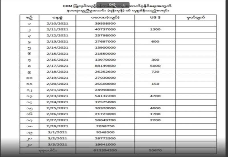 ရန်ကုန်တိုင်းဒေသကြီး၊ ဒဂုံမြို့သစ်(မြောက်ပိုင်း)မြို့နယ်၊ အမှတ်(၄၂)ရပ်ကွက်၊ ဗိုလ်မှူး ဗထူးလမ်း၊ အမှတ်(၁၃/က) ရှိ နာရေးကူညီမှုအသင်း(ရန်ကုန်)၏ ဘဏ္ဍာရေးမှူး ဖြစ်သူ ဒေါ်မြင့်မြင်ခင်ဖေ(ခ)ဒေါ်ရွှေဇီးကွက် အား CDM တွင် ပါဝင်လှုပ်ရှားနေသည့် နိုင်ငံ့ဝန်ထမ်းများအား အားပေးအားမြှောက်ပြုမှုဖြင့် ဖေဖော်ဝါရီ ၂၅ ရက်နေ့တွင် မရမ်းကုန်း မြို့မရဲစခန်း၌ ရာဇသတ်ကြီး ပုဒ်မ ၅၀၅(က)ဖြင့် အမှုဖွင့်တိုင်ကြားခဲ့ကြောင်း သိရှိရသည်။