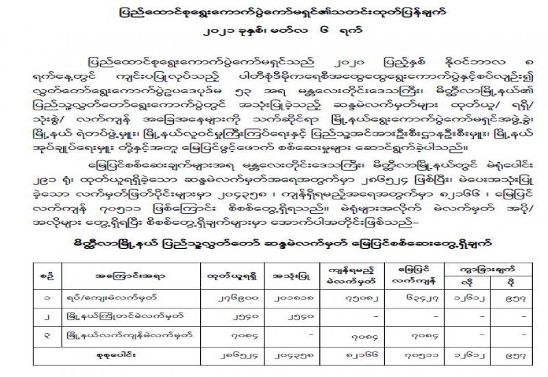 (၆-၃-၂၀၂၁)ရက်နေ့၊ ည (၈:၀၀)နာရီမှ (၇-၃-၂၀၂၁)ရက်နေ့၊ ည (၈:၀၀)နာရီအတွင်း ဓာတ်ခွဲ နမူနာစုစုပေါင်း (၁,၅၄၉) ခုအား စစ်ဆေးပြီးစီးခဲ့ရာ COVID-19 ရောဂါဓာတ်ခွဲအတည်ပြု လူနာသစ် (၁၁) ဦး တွေ့ရှိရပါသည်။ သို့ဖြစ်ပါ၍ ယနေ့အထိ ဓာတ်ခွဲနမူနာ စုစုပေါင်း (၂,၅၀၂,၄၅၃) ခုအား စစ်ဆေးခဲ့ပြီး COVID-19 ဓာတ်ခွဲအတည်ပြုလူနာ စုစုပေါင်း (၁၄၂,၀၃၄) ဦး ရှိပြီ ဖြစ်ပါသည်။