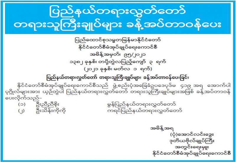 ပြည်ထောင်စုစာရင်းစစ်ချုပ်နှင့် တိုင်းဒေသကြီး/ ပြည်နယ်စာရင်းစစ် ချုပ်ရုံးများရှိ ဝန်ထမ်းများ တွေ့ဆုံပွဲကို ယနေ့ နံနက် ၁၀ နာရီတွင် ပြည်ထောင်စုစာရင်းစစ်ချုပ်ရုံး အစည်းအဝေးခန်းမ၌ Virtual System ဖြင့် ကျင်းပ သည်။