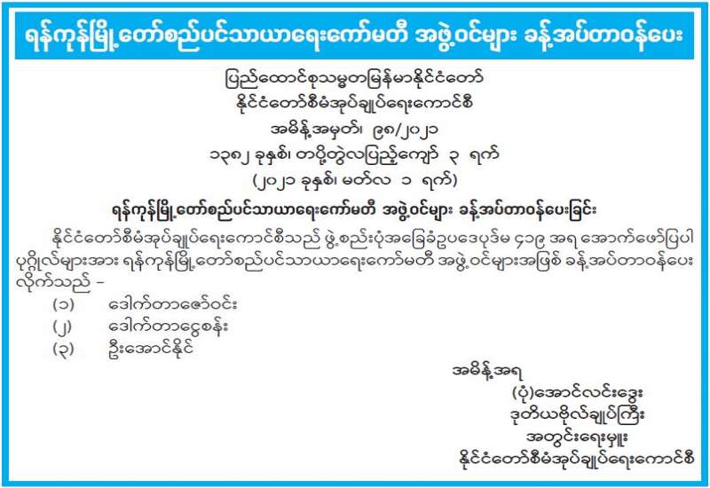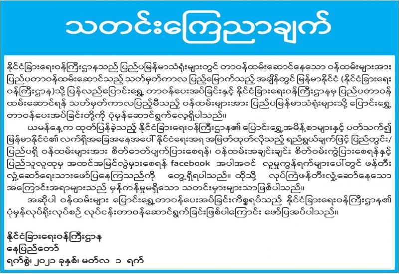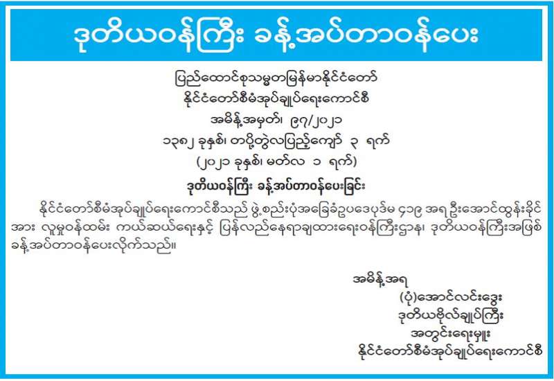 ပြည်ထောင်စုသမ္မတမြန်မာနိုင်ငံတော်၊ နိုင်ငံတော်စီမံအုပ်ချုပ်ရေးကောင်စီက ကြီးမှူးကျင်းပမည့် ၂၀၂၁ ခုနှစ်၊ သာသနာတော်ဆိုင်ရာဘွဲ့တံဆိပ်တော်များ ဆက်ကပ်လှူဒါန်းပွဲအခမ်းအနား ကျင်းပရေး ဦးစီးကော်မတီနှင့် လုပ်ငန်းကော်မတီ ညှိနှိုင်းအစည်းအဝေးကို ယနေ့နံနက် ၁၀ နာရီတွင် နေပြည်တော်ရှိ သာသနာရေးနှင့်ယဉ်ကျေးမှုဝန်ကြီးဌာန အစည်းအဝေးခန်းမ၌ ကျင်းပသည်။