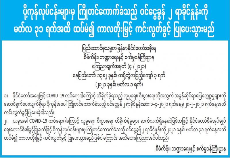ကမ္ဘာတစ်ဝန်း၌ ကိုဗစ်-၁၉ ရောဂါ ကပ်ဆိုးကြီးကြောင့် နိုင်ငံတကာ အားကစားပြိုင်ပွဲများ ကျင်းပရန် ရပ်နားရွှေ့ဆိုင်းခဲ့ပြီး ပြည်တွင်း အားကစားပြိုင်ပွဲများလည်းကျင်းပ နိုင်ခြင်းမရှိခဲ့ဘဲ ယခု ကိုဗစ်-၁၉ ရောဂါ လျော့နည်း လာပြီး ရောဂါ ကာကွယ်မှု နည်းလမ်းများ ပြုလုပ် နိုင်ပြီဖြစ်သောကြောင့် ၂၀၂၁ ခုနှစ် အတွင်း နိုင်ငံ တကာအားကစား ပြိုင်ပွဲများ ကိုဗစ်-၁၉ စည်းကမ်း နှင့်အညီ ပြန်လည်ကျင်းပမည်ဖြစ် သောကြောင့် မြန်မာနိုင်ငံ အနေဖြင့် နိုင်ငံတကာ အားကစားပြိုင်ပွဲများ ပါဝင်ယှဉ်ပြိုင်ရေး၊ ပြည်တွင်း အားကစားပြိုင်ပွဲများ ကိုဗစ်-၁၉ စည်းကမ်းနှင့်အညီ ပြန်လည် ကျင်းပနိုင်ရေး ညှိနှိုင်းအစည်းအဝေးကို ယနေ့နံနက် ၉ နာရီတွင် နေပြည်တော် ရုံးအမှတ်(၃၁)ရှိအစည်းအဝေးခန်းမ၌ ဗီဒီယို ကွန်ဖရင့်စနစ်ဖြင့် ကျင်းပသည်။