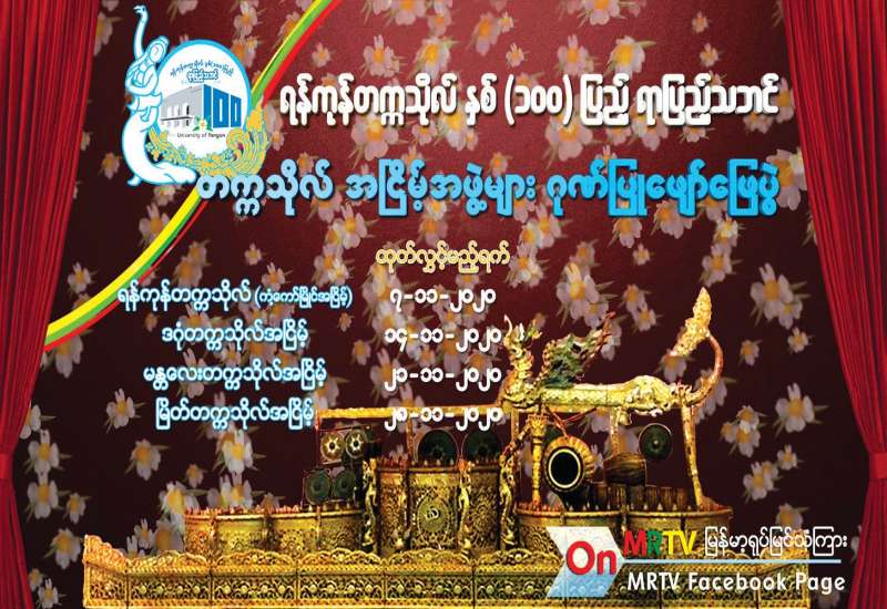 ဒီဇင်ဘာ ၁ ရက်တွင် ကျရောက်မည့် ရန်ကုန်တက္ကသိုလ် နှစ်(၁၀၀) ပြည့်၊ ရာပြည့်သဘင်အား ဂုဏ်ပြုသောအားဖြင့် တက္ကသိုလ်အငြိမ့်အဖွဲ့များ၏ ဖျော်ဖြေပွဲများကို မြန်မာ့အသံနှင့် ရုပ်မြင်သံကြားမှ ထုတ်လွှင့်တင်ဆက်နိုင်ရန် ပြန်ကြားရေးဝန်ကြီးဌာနနှင့် ပညာရေးဝန်ကြီးဌာနတို့ ပူးပေါင်း၍ ကျန်းမာရေးဆိုင်ရာ ညွှန်ကြားချက်များ အထူးဂရုပြုပြီး စီစဉ်ဆောင်ရွက် လျက်ရှိသည်။