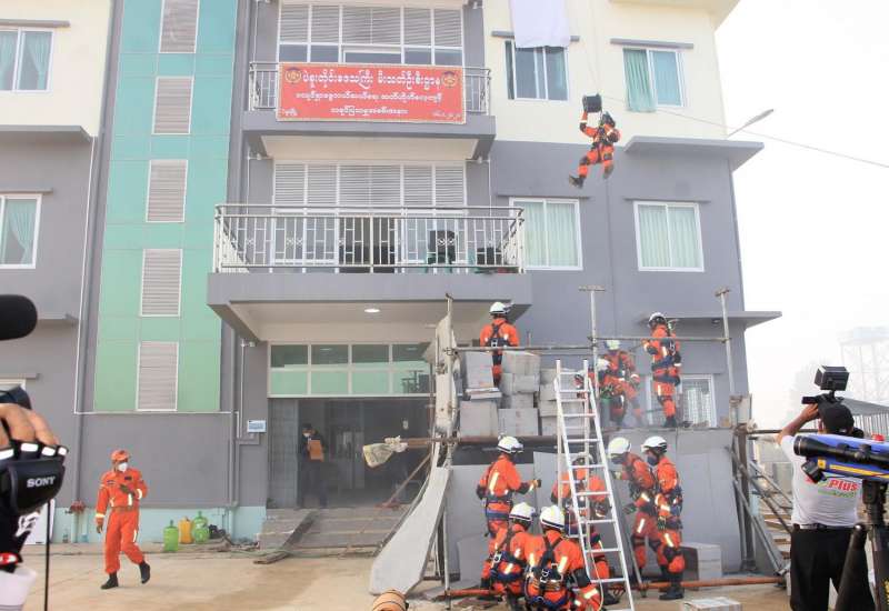 ပဲခူးမြို့၊ ဥဿာမြို့သစ်၊(၇)ရပ်ကွက်၊ ဓမ္မစေတီလမ်းရှိ (၆)ထပ်စုပေါင်းရုံးတွင် ယနေ့ နံနက် ၈နာရီက သဘာဝဘေးအန္တရာယ်ဖြစ်သည့် မြေငလျင်ဘေးအန္တရာယ်ကြုံတွေ့လာပါက အရေးပေါ်ရှာဖွေ ကယ်ဆယ်ရေး လုပ်ငန်းများကို အချိန်နှင့်တပြေးညီ ဆောင်ရွက်နိုင် မီးသတ်တပ်ဖွဲ့ဝင်များက တပ်ခွဲအဆင့် မြေငလျင်ဘေး အန္တရာယ် ရှာဖွေကယ်ဆယ်ရေး ဇာတ်တိုက်လေ့ကျင့်သရုပ်ပြခြင်း အခမ်းအနားကျင်းပ ပြုလုပ်ခဲ့သည်။