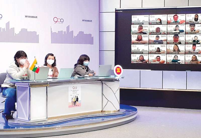(၉) ကြိမ်မြောက် အာဆီယံဉာဏ်စမ်းပဟေဠိ ဒေသတွင်းအဆင့်ပြိုင်ပွဲ (9th ASEAN Quiz- Regional Level) ကို ယမန်နေ့ နံနက် ၇ နာရီခွဲတွင် စင်ကာပူနိုင်ငံက အလှည့်ကျအိမ်ရှင်အဖြစ် အွန်လိုင်းမှတစ်ဆင့် ပြုလုပ်ရာ မြန်မာနိုင်ငံကိုယ်စားပြု ကျောင်းသူသုံးဦး ရန်ကုန်မြို့ မြန်မာ့အသံနှင့် ရုပ်မြင်သံကြားရှိ စတူဒီယိုခန်းမမှ ပါဝင်ယှဉ်ပြိုင်ကြသည်။
