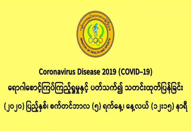 ၁။ (၅-၉ -၂၀၂၀) ရက်နေ့အတွက် COVID-19 ရောဂါ ဓာတ်ခွဲစစ်ဆေးရာတွင် - - အမျိုးသားကျန်းမာရေးဓာတ်ခွဲမှုဆိုင်ရာဌာန (ရန်ကုန်) (NHL) မှ (ပထမအသုတ်) ဓာတ်ခွဲနမူနာ (၇၄၅)ခု၊ - ဆေးသုတေသနဦးစီးဌာန (DMR)မှ (ပထမအသုတ်) ဓာတ်ခွဲနမူနာ (၁၄၇) ခု၊ - ပြည်သူ့ကျန်းမာရေးဓာတ်ခွဲမှုဆိုင်ရာဌာန (မန္တလေး) မှ (ပထမအသုတ်) ဓာတ်ခွဲနမူနာ (၃၃၉) ခု၊ - ပြည်သူ့ကျန်းမာရေးဓာတ်ခွဲမှုဆိုင်ရာဌာန (မော်လမြိုင်) မှ ဓာတ်ခွဲနမူနာ (၂၂၄) ခု၊ - ပြည်သူ့ဆေးရုံကြီး၊ စစ်တွေမြို့မှ ဓာတ်ခွဲနမူနာ (၇၆) ခု၊ - ပြည်သူ့ဆေးရုံကြီး၊ ကျောက်ဖြူမြို့မှ ဓာတ်ခွဲနမူနာ (၅၉) ခု၊ - ပြည်သူ့ဆေးရုံကြီး၊ ပုသိမ်မြို့မှ ဓာတ်ခွဲနမူနာ (၁၁) ခု၊ - နေပြည်တော် ပြည်သူ့ဆေးရုံကြီး ခုတင် (၁၀၀၀)မှ ဓာတ်ခွဲနမူနာ (၃၁) ခု၊ - ပြည်သူ့ဆေးရုံကြီး၊ မူဆယ်မြို့မှ ဓာတ်ခွဲနမူနာ (၇) ခု၊ - အမှတ်(၁) တပ်မတော်ဆေးရုံကြီး (ကုတင်-၁၀၀၀) မှ ဓာတ်ခွဲနမူနာ (၅၂) ခုနှင့် - စုစုပေါင်း (၁,၆၉၁)ခု အား ယနေ့၊ ညနေတွင် စစ်ဆေးပြီးစီးခဲ့ရာ - • COVID-19 ရောဂါ ဓာတ်ခွဲအတည်ပြုလူနာသစ် (၃၇) ဦး တွေ့ရှိရပါသည်။
