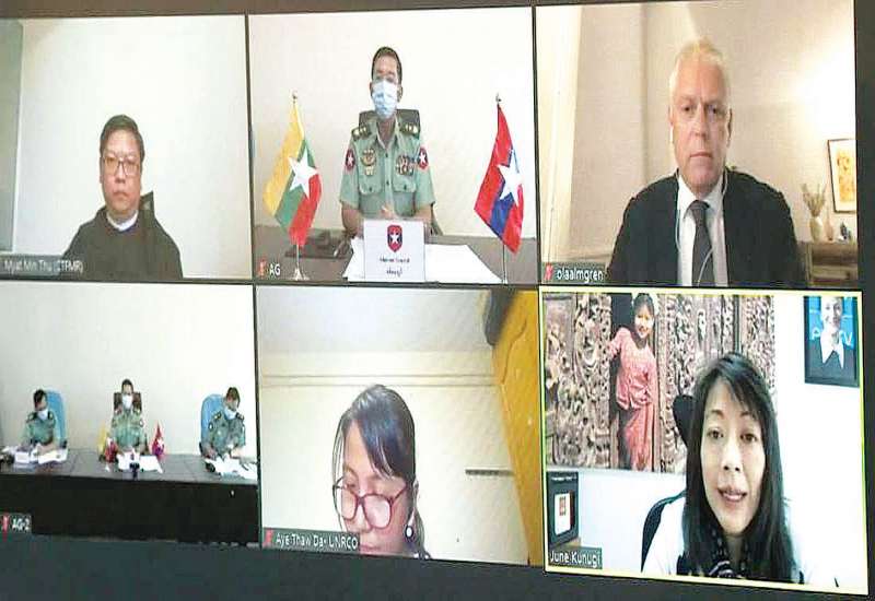 အရွယ်မရောက်သေးသူ ကလေးသူငယ်များအား စစ်မှုထမ်းခြင်းမှ ကာကွယ်တားဆီးရေးကိစ္စနှင့်စပ်လျဉ်း၍ ယမန်နေ့နံနက်ပိုင်းက Video Conference ဖြင့်ကျင်းပရာ ကာကွယ်ရေးဦးစီးချုပ်ရုံး (ကြည်း)မှ စစ်ရေးချုပ် ဒုတိယဗိုလ်ချုပ်ကြီး မျိုးဇော်သိန်းနှင့် တပ်မတော်အရာရှိကြီးများ၊ CTFMR ပူးတွဲဥက္ကဋ္ဌများ ဖြစ်ကြသည့် မြန်မာနိုင်ငံဆိုင်ရာကုလသမဂ္ဂဌာနေညှိနှိုင်းရေးမှူး Mr. Ola Almgren၊ မြန်မာနိုင်ငံဆိုင်ရာ ယူနီဆက် ကိုယ်စားလှယ် Ms. June Kunugi နှင့် တာဝန်ရှိသူများ တက်ရောက်ကြသည်။