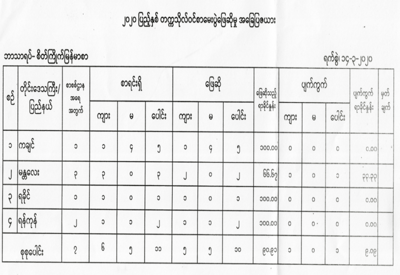 ယနေ့ဖြေဆိုသည့် စိတ်ကြိုက်မြန်မာစာဘာသာရပ်ကို ကချင်ပြည်နယ်တွင် ၅ ဦး၊ ရန်ကုန်တိုင်းဒေသကြီးတွင် ၂ ဦး၊ မန္တလေးတိုင်းဒေသကြီးတွင် ၂ ဦးနှင့် ရခိုင်ပြည်နယ်တွင် တစ်ဦး စုစုပေါင်း ၁၀ ဦး ဖြေဆိုခဲ့ကြောင်း ပညာရေးဝန်ကြီးဌာနမှ သိရသည်။