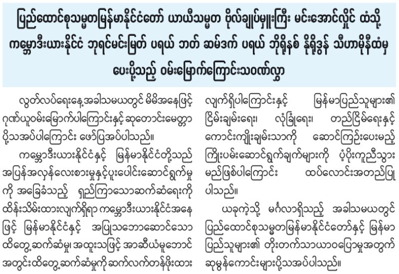 ယနေ့ ဇန်နဝါရီလ ၄ ရက်နေ့တွင် ကျရောက်သော ပြည်ထောင်စုသမ္မတမြန်မာနိုင်ငံတော်၏ (၇၈) နှစ်မြောက် လွတ်လပ်ရေးနေ့အခါသမယ၌ မိဘပြည်သူများနှင့် တိုင်းရင်းသားအားလုံး ကိုယ်စိတ်နှစ်ဖြာကျန်းမာရွှင်လန်းပြီး ကျက်သရေမင်္ဂလာအပေါင်းနှင့် ပြည့်စုံကြပါစေကြောင်း ဆုမွန်ကောင်းတောင်းလျက် နှုတ်ခွန်းဆက်သအပ်ပါသည်။