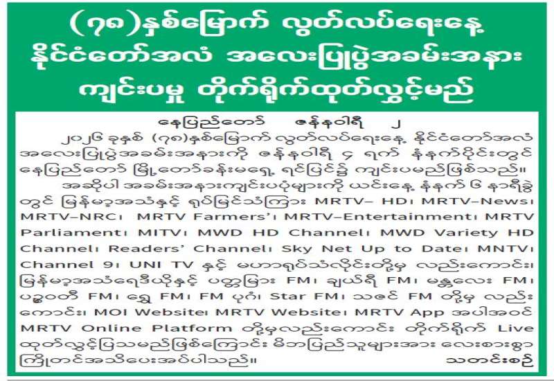 (၇၈) နှစ်မြောက် လွတ်လပ်ရေးနေ့ နိုင်ငံတော်အလံ အလေးပြုပွဲအခမ်းအနား ကျင်းပမှု တိုက်ရိုက်ထုတ်လွှင့်မည်