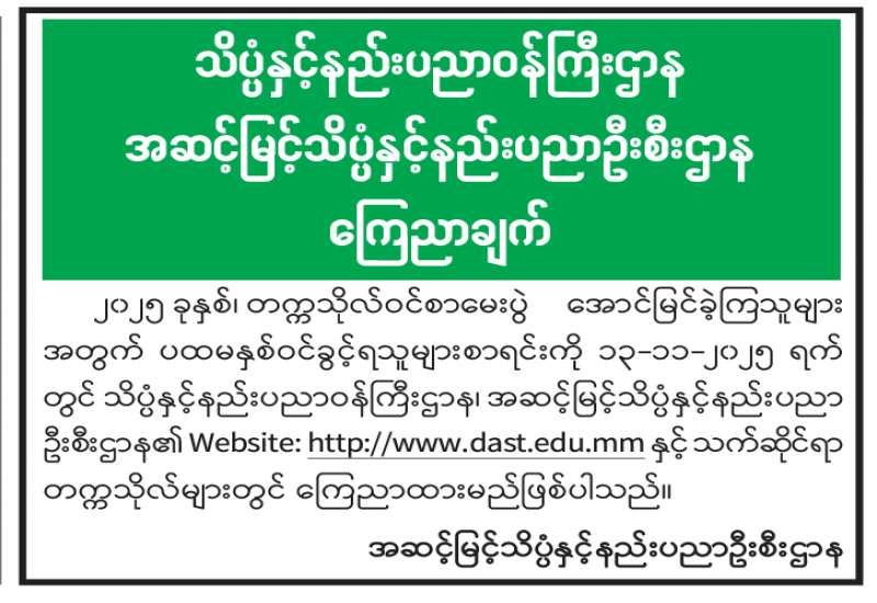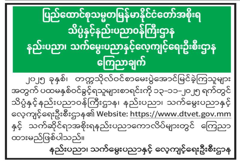 ပြည်ထောင်စုသမ္မတမြန်မာနိုင်ငံတော်အစိုးရ သိပ္ပံနှင့်နည်းပညာဝန်ကြီးဌာနနည်းပညာ၊ သက်မွေးပညာနှင့်လေ့ကျင့်ရေးဦးစီးဌာနကြေညာချက်