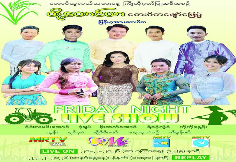 မြန်မာ့အသံနှင့်ရုပ်မြင်သံကြားအနေဖြင့် ပြည်သူများအပန်းပြေစေရန်နှင့် စိတ်ခွန်အားသစ်များရရှိနိုင်ရန် ရည်ရွယ်ပြီး Friday Night Live Show တေးဂီတဖျော်ဖြေပွဲများကို ဆန်းသစ်တင်ဆက်လျက်ရှိရာ တောင်သူလယ်သမားနေ့ကို ကြိုဆိုဂုဏ်ပြုသည့်အနေဖြင့် “တို့တောင်ယာ” တေးဂီတဖျော်ဖြေပွဲကို ဖေဖော်ဝါရီ ၂၀ ရက် သောကြာနေ့ညချမ်းတွင် ဖျော်ဖြေတင်ဆက်မည်ဖြစ်သည်။