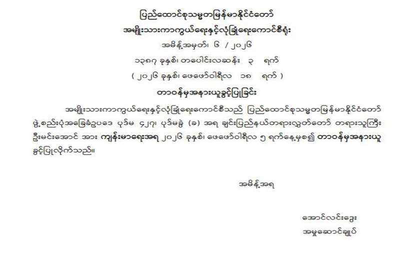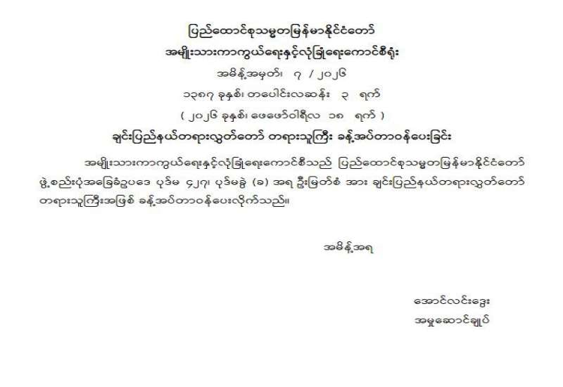 ချင်းပြည်နယ်တရားလွှတ်တော် တရားသူကြီး ခန့်အပ်တာဝန်ပေးခြင်း