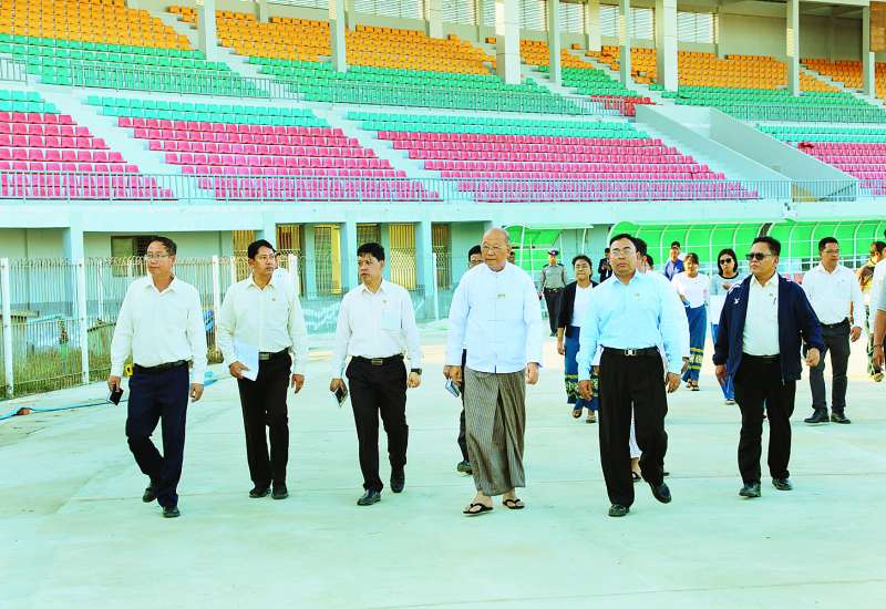 မြန်မာနိုင်ငံ အိုလံပစ်ကော်မတီဥက္ကဋ္ဌ အားကစားနှင့်လူငယ်ရေးရာဝန်ကြီးဌာနနှင့် ဟိုတယ်နှင့်ခရီးသွားလာရေးဝန်ကြီးဌာန ပြည်ထောင်စုဝန်ကြီး Jeng Phang နော်တောင်သည် ဒုတိယဝန်ကြီး ဦးထိန်လင်း၊ တာဝန်ရှိသူများနှင့်အတူ ယနေ့မွန်းလွဲပိုင်းတွင် မန္တလေးငလျင်ကြောင့် ထိခိုက်ပျက်စီးခဲ့သည့် ပြည်ထောင်စုနယ်မြေ နေပြည်တော်ကောင်စီ၏ ပင်မအားကစားကွင်းဖြစ်သည့် ရွှေကြာပင်အားကစားကွင်းအတွင်းရှိ ဘောလုံးကွင်းဂျပန်မြက်များ ပြန်စိုက်နိုင်ရေးအတွက် ကွင်းမြေညှိခြင်း၊ မီတာ ၄၀၀ Synthetic ပြေးလမ်းခင်းကျင်းခြင်းနှင့် မိုးလုံလေလုံအားကစားရုံ ပြန်လည်ပြုပြင်ခြင်းလုပ်ငန်းဆောင်ရွက်နေမှု အခြေအနေများကို လိုက်လံကြည့်ရှုစစ်ဆေးသည်။