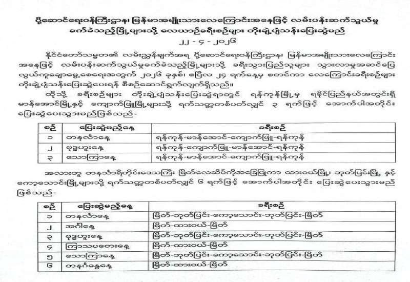 နိုင်ငံတော်သမ္မတ၏လမ်းညွှန်မှာကြားချက်အရ ပို့ဆောင်ရေးဝန်ကြီးဌာန မြန်မာ့မီးရထားသည် ခရီးသွား ပြည်သူများအဆင်ပြေစွာသွားလာနိုင်ရေးအတွက် ရန်ကုန် - မန္တလေး - ရန်ကုန်ရထားခရီးစဉ်အဖြစ် အမှတ် (၅) အဆန်/ အမှတ် (၆) အစုန် လေအေးပေးစက်ပါခေတ်မီ DEMU လူစီးအမြန်ရထားအား ၂၀၂၆ ခုနှစ် မေ ၁ ရက်မှစတင်၍ အောက်ပါအချိန်ဇယားအတိုင်း ပြေးဆွဲပေးသွားမည်ဖြစ်သည်။