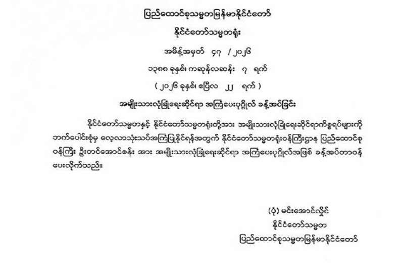 နိုင်ငံတော်သမ္မတဦးဆောင်သည့် အမျိုးသားစည်းလုံးညီညွတ်ရေးနှင့် ငြိမ်းချမ်းရေးဖော်ဆောင်မှု ဗဟိုကော်မတီက NCA လက်မှတ်ရေးထိုးထားသည့် တိုင်းရင်းသားလက်နက်ကိုင်အဖွဲ့အစည်းများ၊ NCA လက်မှတ်မရေးထိုးရသေးသည့် တိုင်းရင်းသားလက်နက်ကိုင်အဖွဲ့အစည်းများ၊ NCA လက်မှတ်ရေးထိုးထားပြီး အကြောင်းအမျိုးမျိုးကြောင့် NCA လမ်းကြောင်းမှ သွေဖည်နေသည့် တိုင်းရင်းသားလက်နက်ကိုင်အဖွဲ့အစည်းများအား လွတ်လပ်ပြီး ကြိုတင်ကန့်သတ်ချက်များမထားသည့် ဆွေးနွေးပွဲများ ကျင်းပပြုလုပ်နိုင်ရန် အလေးအနက်ပြု ဖိတ်ခေါ်ကမ်းလှမ်းလိုက်ပြီဖြစ်သည်။