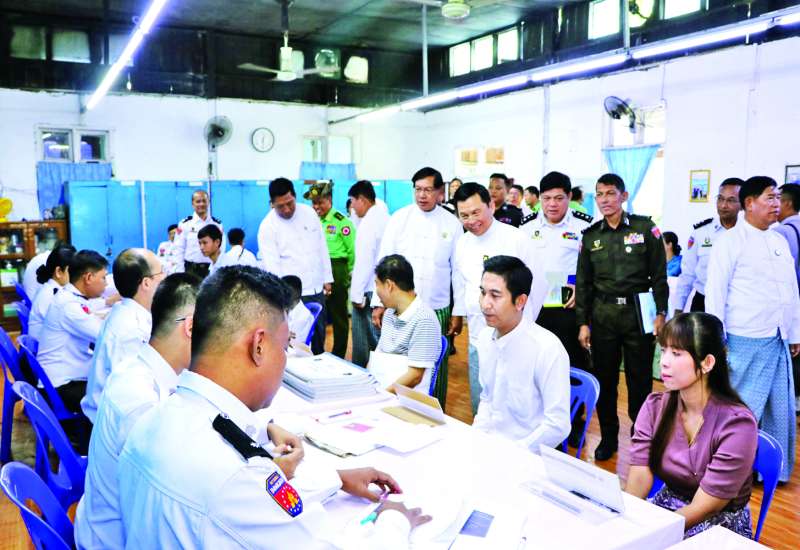 လူဝင်မှုကြီးကြပ်ရေးနှင့် ပြည်သူ့အင်အားဝန်ကြီးဌာန ပြည်ထောင်စုဝန်ကြီး ဦးမြင့်ကြိုင်သည် ရန်ကုန် တိုင်းဒေသကြီးဝန်ကြီးချုပ် ဦးစိုးသိန်းနှင့် တိုင်းဒေသကြီးဝန်ကြီးများ၊ တာဝန်ရှိသူများနှင့်အတူ ယနေ့နံနက်ပိုင်းက ရန်ကုန်တိုင်းဒေသကြီး စမ်းချောင်းမြို့နယ် လူဝင်မှုကြီးကြပ်ရေးနှင့် ပြည်သူ့အင်အားဝန်ကြီးဌာန မြို့နယ်ဦးစီးမှူးရုံး၌ ဝန်ထမ်းများက အိမ်ထောင်စုလူဦးရေစာရင်းနှင့် နိုင်ငံသား စိစစ်ရေးကတ်ပြား ပျက်စီး/ ပျောက်ဆုံးသွားသည့် ဒေသခံပြည်သူများနှင့် အသက် ၁၈ နှစ်ပြည့် နိုင်ငံသားစိစစ်ရေးကတ် မလျှောက်ထားသေးသူများကို ပန်းခင်းစီမံချက် အဆင့်(၃)ဖြင့် ဆောင်ရွက်ပေးနေမှုကို ကြည့်ရှုအားပေးပြီး လိုအပ်သည်များကို တာဝန်ရှိသူများနှင့် ညှိနှိုင်းဆောင်ရွက်ပေးသည်။