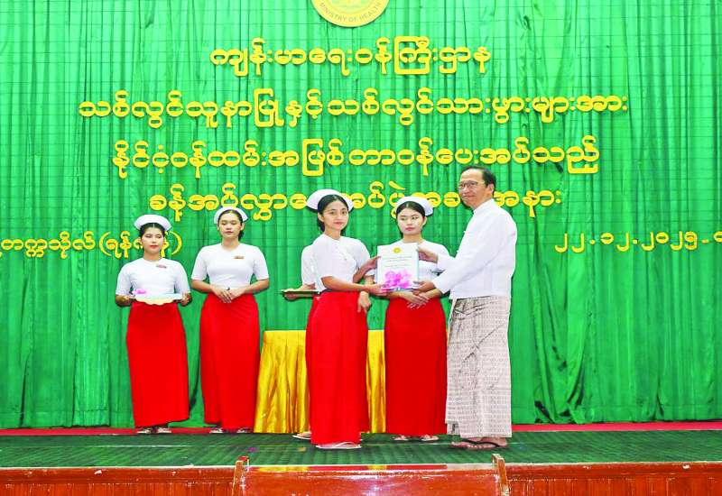 ကျန်းမာရေးဝန်ကြီးဌာနမှ သူနာပြု - သားဖွား ဒီပလိုမာ သုံးနှစ်သင်တန်းဆင်းမည့် သစ်လွင်သူနာပြုများနှင့် သားဖွားဒီပလိုမာ နှစ်နှစ်သင်တန်းဆင်းမည့် သစ်လွင်သားဖွားများကို နိုင်ငံ့ဝန်ထမ်းအဖြစ် တာဝန်ပေးအပ်သည့် ခန့်အပ်လွှာပေးအပ်ပွဲကို ယနေ့နံနက်ပိုင်းတွင် သူနာပြုတက္ကသိုလ်(ရန်ကုန်) Auditorium ခန်းမ၌ Hybrid စနစ်ဖြင့်ကျင်းပရာ ကျန်းမာရေးဝန်ကြီးဌာန ပြည်ထောင်စုဝန်ကြီးပါမောက္ခ ဒေါက်တာသက်ခိုင်ဝင်း၊ ရန်ကုန်တိုင်းဒေသကြီးဝန်ကြီးချုပ် ဦးစိုးသိန်း၊ မြန်မာနိုင်ငံသူနာပြုနှင့် သားဖွားကောင်စီဥက္ကဋ္ဌ၊ ဌာနဆိုင်ရာတာဝန်ရှိသူများ၊ သစ်လွင်သူနာပြုများနှင့် သစ်လွင်သားဖွားများ တက်ရောက်ကြသည်။