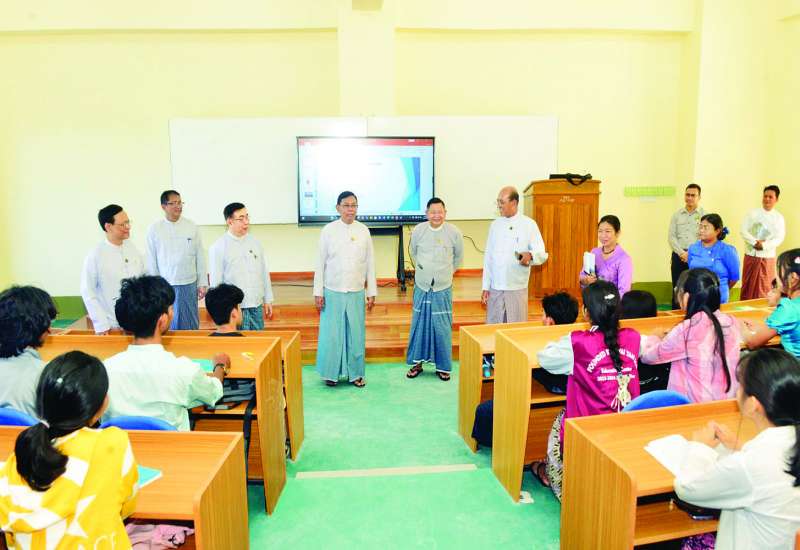 ပြည်ထောင်စုဝန်ကြီး ဒေါက်တာညွန့်ဖေနှင့် ဦးမျိုးသန့်သည် ဒုတိယဝန်ကြီးများနှင့်အတူ ယနေ့တွင် Naypyitaw State Academy အတွင်း တည်ဆောက်နေသည့် ဘွဲ့နှင်းသဘင်ခန်းမ၊ Recreation Center ၊ စာသင်ဆောင်များ၊ အိပ်ဆောင်နှင့်ထမင်းစားဆောင် တည်ဆောက်ရေးလုပ်ငန်းများ ဆောင်ရွက်နေမှု အခြေအနေတို့ကို လှည့်လည်ကြည့်ရှုစစ်ဆေးသည်။