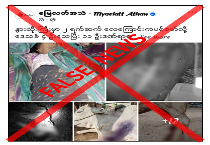 မန္တလေးတိုင်းဒေသကြီး၊ နွားထိုးကြီးမြို့တွင် လေကြောင်းမှ တိုက်ခိုက်မှုကြောင့် ဒေသခံပြည်သူ ၄ ဦးသေဆုံးပြီး ၁၁ ဦးဒဏ်ရာရရှိခဲ့သည်ဟု တရားမဝင်ပြည်ဖျက်မီဒီယာများက သတင်းအမှားများကို လုပ်ကြံရေးသားဖြန့်ဝေလျက်ရှိသည်။
