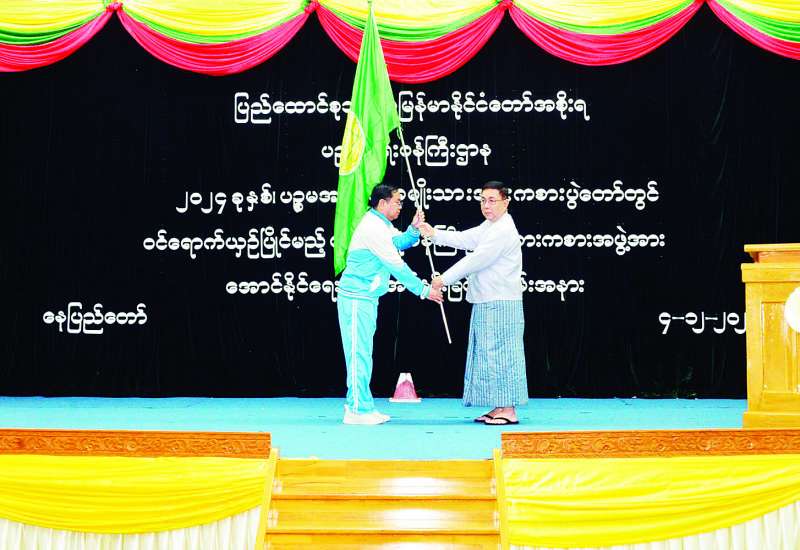 ပဉ္စမအကြိမ် အမျိုးသားအားကစားပွဲတော်တွင်ပါဝင် ယှဉ်ပြိုင်ကြမည့် ပြည်ထောင်စုစာရင်းစစ်ချုပ်ရုံးကိုယ်စားပြု အားကစားသမားများအားအောင် နိုင်ရေးအလံ ပေးအပ်ပွဲကို ယနေ့မွန်းလွဲပိုင်းတွင် နေပြည်တော်ရှိ ပြည်ထောင်စုစာရင်းစစ်ချုပ်ရုံး နဝရတ်ခန်းမ၌ကျင်းပရာ ပြည်ထောင်စုစာရင်းစစ်ချုပ် ဒေါက်တာခင်နိုင်ဦး၊ ဒုတိယစာရင်းစစ်ချုပ်နှင့် တာဝန်ရှိသူများ၊ အားကစားအသင်း အုပ်ချုပ်သူ၊ နည်းပြများနှင့် အားကစားသမားများ တက်ရောက်ကြပြီး ရန်ကုန်တိုင်းဒေသကြီး၊ ရှမ်းပြည်နယ်၊ ဧရာဝတီတိုင်းဒေသကြီး စာရင်းစစ်ချုပ်ရုံးမှ တာဝန်ရှိသူများက Online ဖြင့် တက်ရောက်ကြသည်။
