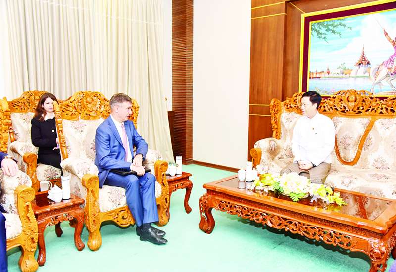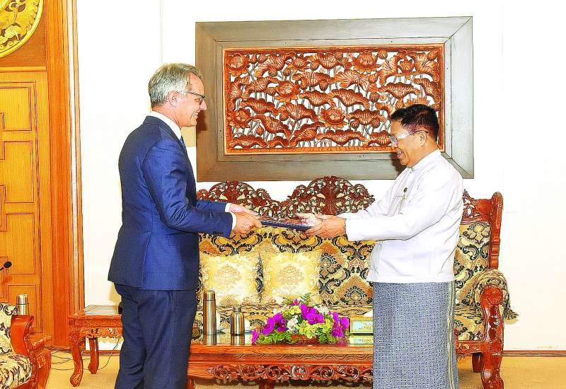 ဒုတိယဝန်ကြီးချုပ်နှင့် နိုင်ငံခြားရေးဝန်ကြီးဌာန ပြည်ထောင်စုဝန်ကြီး ဦးသန်းဆွေထံ ကုလသမဂ္ဂ ကမ္ဘာ့စားနပ်ရိက္ခာအစီအစဉ် (United Nations World Food Programme - WFP) ၏ မြန်မာနိုင်ငံဆိုင်ရာ ဌာနေကိုယ်စားလှယ်အဖြစ် တာဝန်ထမ်းဆောင်မည့် Mr. Michael John Dunford သည် ယနေ့နံနက် ၁၀ နာရီတွင် နေပြည်တော်ရှိ နိုင်ငံခြားရေးဝန်ကြီးဌာန၌ ၎င်း၏ခန့်အပ်လွှာကို လာရောက်ပေးအပ်သည်။