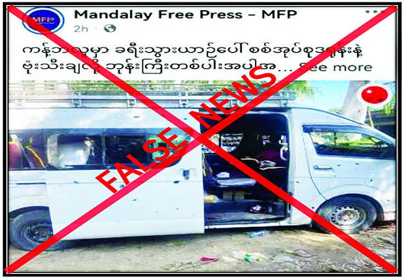 စစ်ကိုင်းတိုင်းဒေသကြီး ကန့်ဘလူမြို့နယ် ရွှေဘို-မြစ်ကြီးနား ကားလမ်းခရီးသွားယာဉ်ပေါ် လုံခြုံရေးတပ်ဖွဲ့ဝင်များက ဒရုန်းဖြင့်ပစ်ခတ်၍ ဘုန်းကြီးတစ်ပါး အပါအဝင် ပြည်သူလေးဦး သေဆုံးသည်ဟု တရားမဝင်ပြည်ဖျက်မီဒီယာများက သတင်းအမှားများ မဟုတ်မမှန် ရေးသားဖြန့်ဝေလျက်ရှိကြောင်း တွေ့ရှိရသည်။